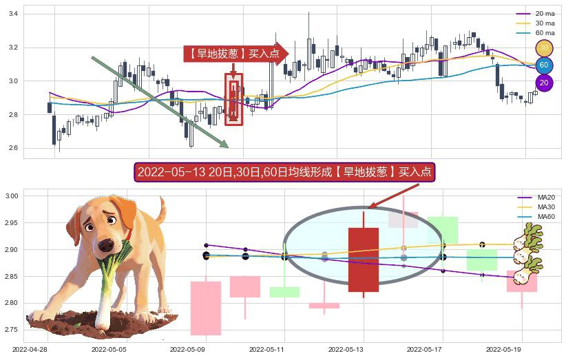 ⚃ 2022-05-25日开盘价格在三条均线下收大阳线,收盘全突破均线,收盘股价上涨9.89%
