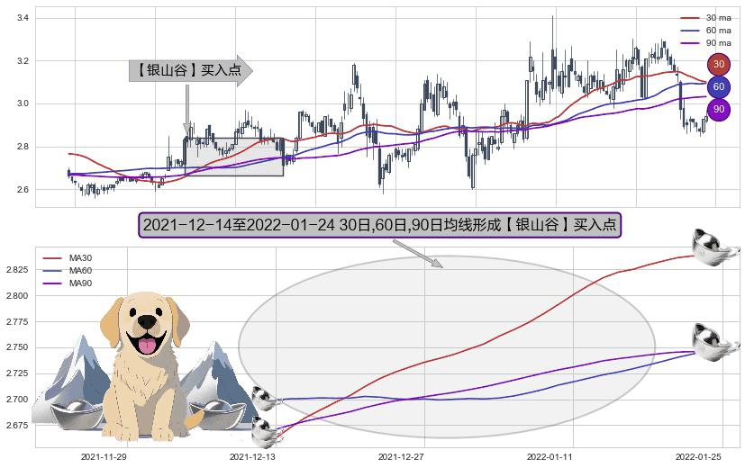 形态多维评估: ⚀ 2021-12-15-日至2022-01-24-日显现 30日-60日-90日均线 【银山谷】买入点 看多信号,后市看涨,买入