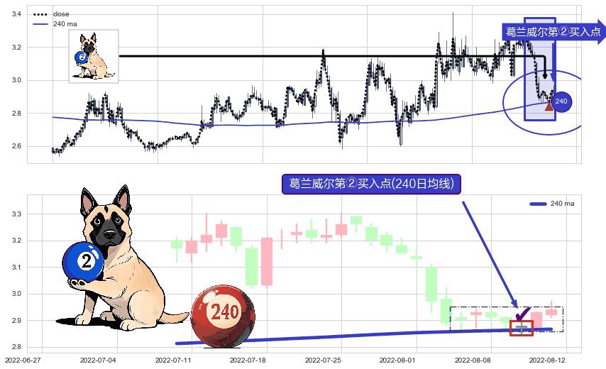 形态多维评估: ⚀ 2022-08-10-日显现 葛兰威尔均线 240日均线 第②买入点 上升趋势的中继信号,后市看涨,买进信号