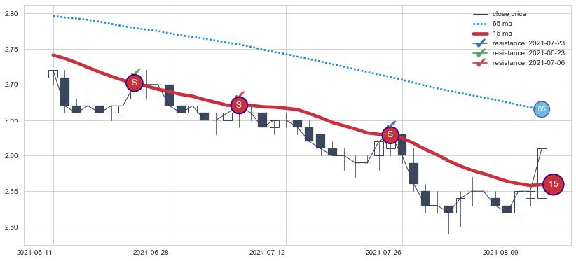 下跌趋势2021-06-11-2021-08-11,均线15确认关键阻力3处