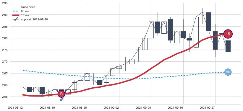 上涨趋势2021-08-12-2021-09-29,均线15确认关键支撑1处