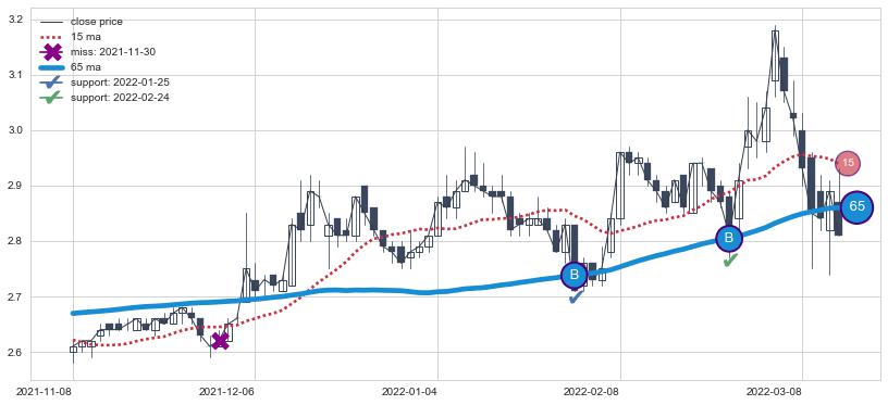 上涨趋势2021-11-08-2022-03-14,均线65确认关键支撑2处