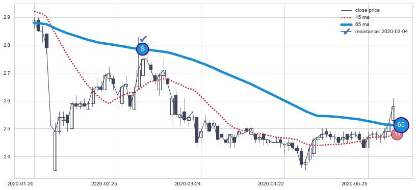 下跌趋势2020-01-20-2020-06-02,均线65确认关键阻力1处