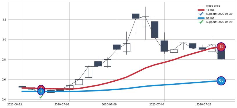 上涨趋势2020-06-23-2020-07-24,均线65, 15确认关键支撑1处