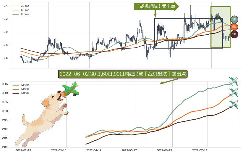 形态多维评估: ⚀ 2022-03-30日-2022-08-01日显现 30日-60日-90日均线 【战机起航】卖出点 看空信号,后市看跌,卖出