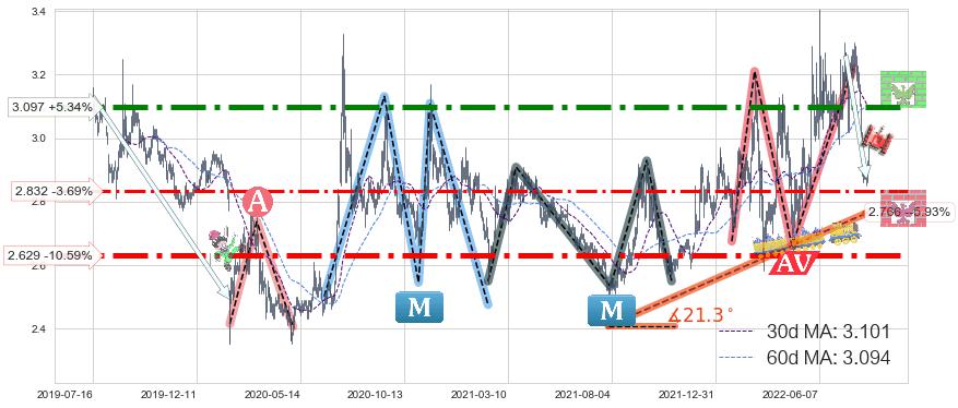 ♘ 阻力价格位3.097,可信任强度91.07%,距离最后交易2022-08-12形成的收盘价格2.940相差 +5.34%