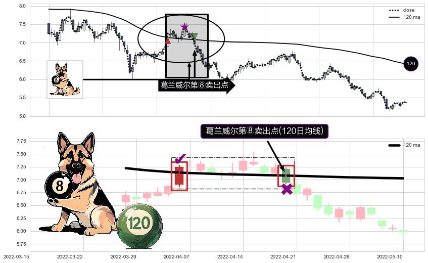 形态多维评估: ⚀ 2022-04-20-日显现 葛兰威尔均线 120日均线 第⑧卖出点 下降趋势的中继信号,后市看跌,卖出信号