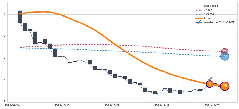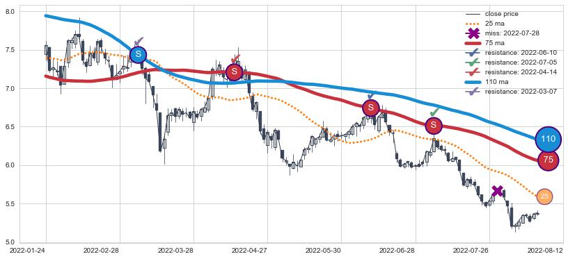 下跌趋势2022-01-24-2022-08-12,均线75, 110确认关键阻力4处