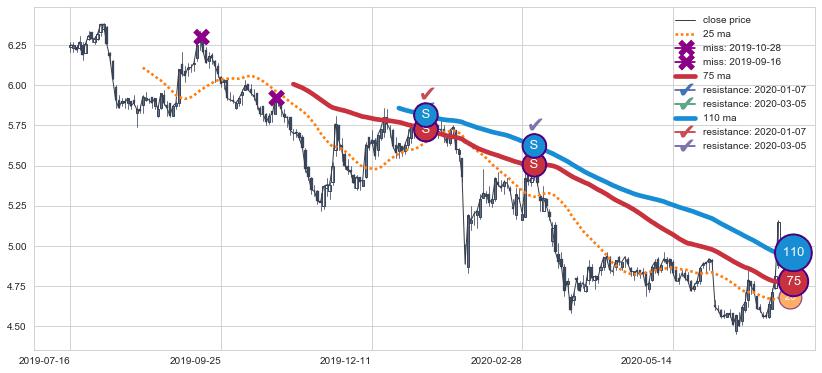 下跌趋势2019-07-16-2020-07-06,均线75, 110确认关键阻力2处