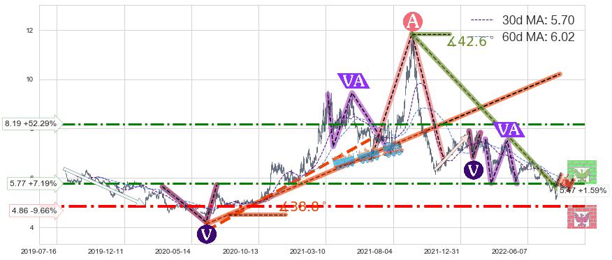 ♘ 阻力价格位5.77,可信任强度60.36%,距离最后交易2022-08-12形成的收盘价格5.38相差 +7.19%