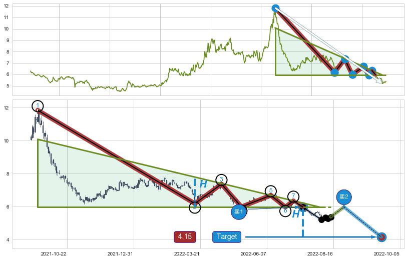 ➢ 【多方力量耗尽,空方打破攻守平衡点】下降三角形中继整理, 已在2022-07-14突破【支撑】颈线 5.97 →演变成下降通道