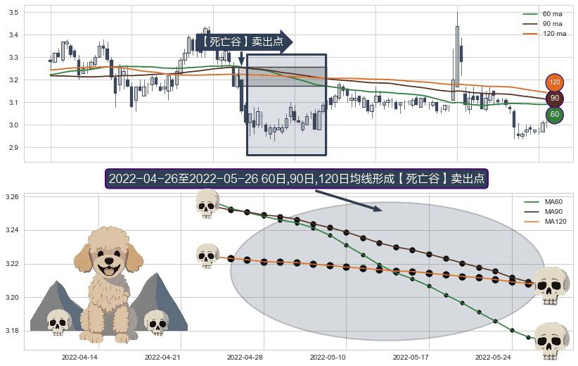 形态多维评估: ⚀ 2022-04-27-日至2022-05-26-日显现 60日-90日-120日均线 【死亡谷】卖出点 看空信号,后市看跌,卖出