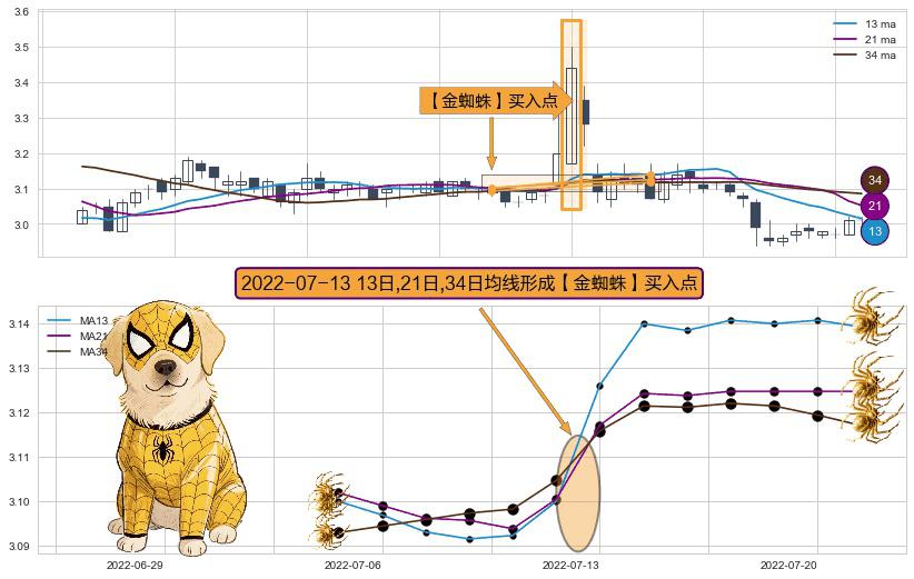 形态多维评估: ⚀ 2022-07-13日显现 13日-21日-34日均线 【金蜘蛛】买入点 看多信号,后市看涨,买入