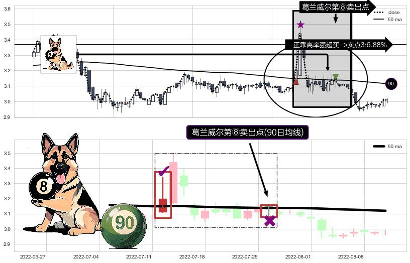 形态多维评估: ⚀ 2022-07-26-日显现 葛兰威尔均线 90日均线 第⑧卖出点 下降趋势的中继信号,后市看跌,卖出信号