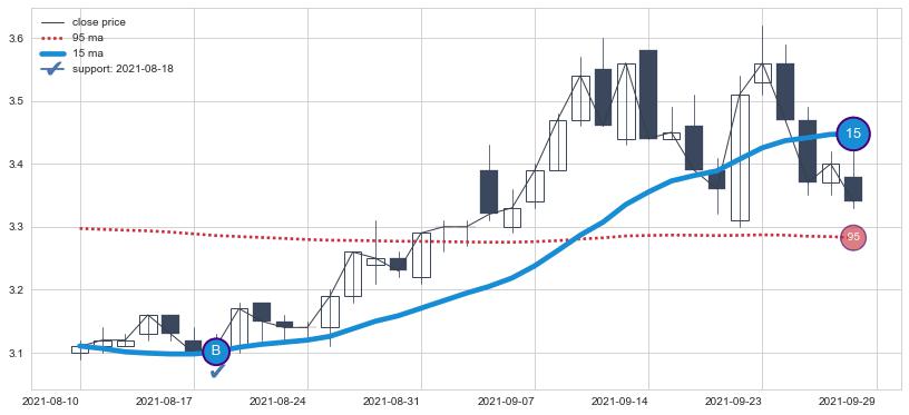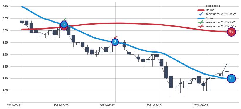 下跌趋势2021-06-11-2021-08-13,均线15, 95确认关键阻力2处