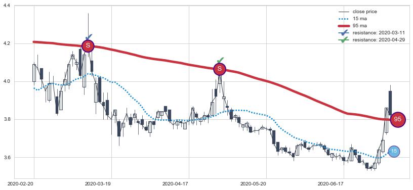 下跌趋势2020-02-20-2020-07-07,均线95确认关键阻力2处