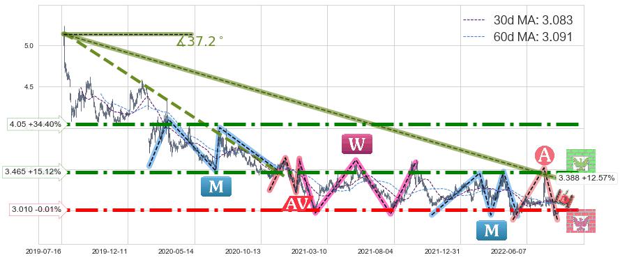 ♞ 30日均线:3.083,60日均线:3.091→ 快线<慢线