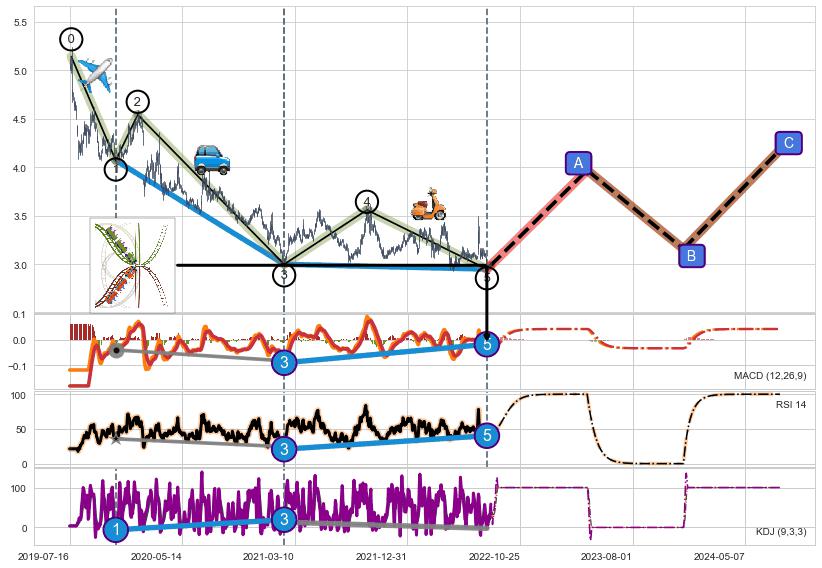 ➣ 1,3,5驱动浪MACD, RSI, KDJ走势都出现【常规背离】反转信号增强