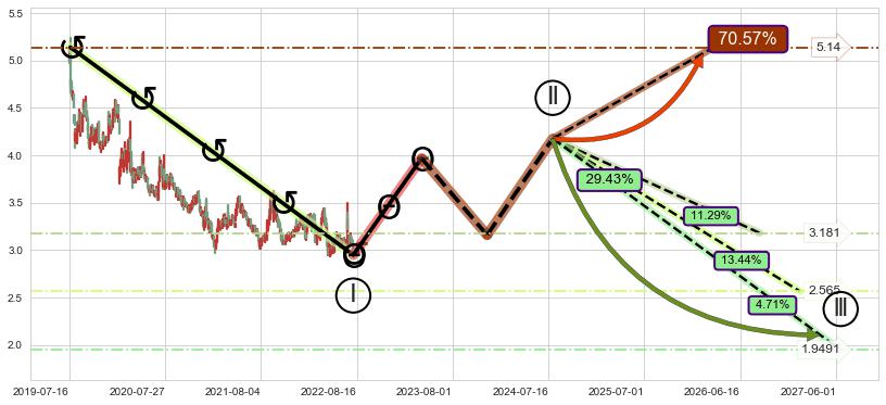 ➣ 循环浪继续向下【平均值】位置(2027-01-20, 2.565),匹配聚类样本比例45.66%, 可能性概率13.44%