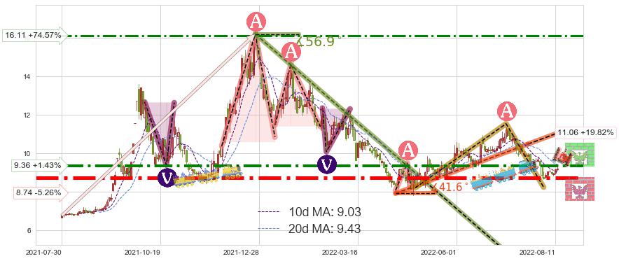 ♘ 阻力价格位9.36,可信任强度75.29%,距离最后交易2022-08-12形成的收盘价格9.23相差 +1.43%