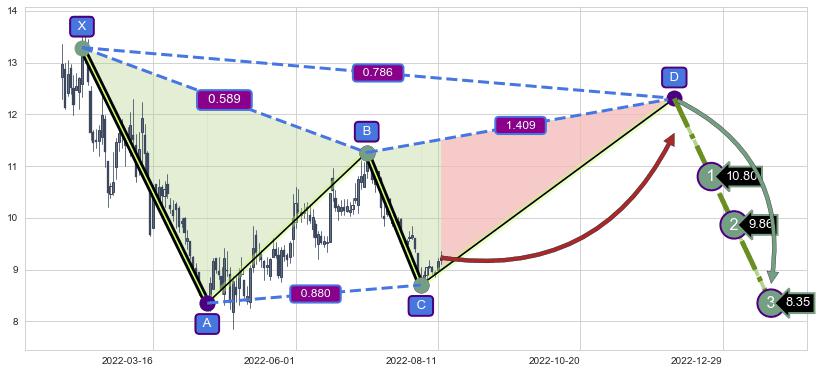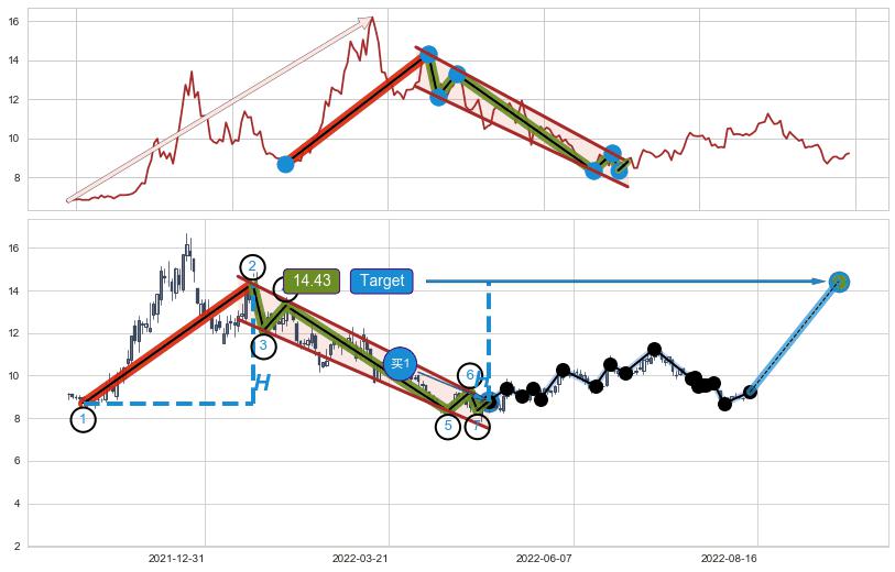 ➣ D点拟合预测价格12.31,距离最后交易收盘价格9.23相差 +33.34%