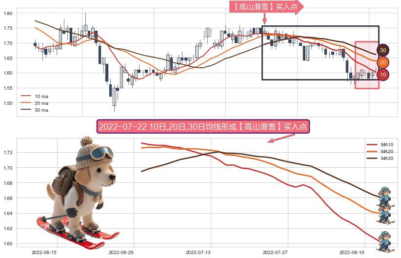 形态多维评估: ⚀ 2022-06-30日-2022-08-12日显现 10日-20日-30日均线 【高山滑雪】买入点 看多信号,后市看涨,买入