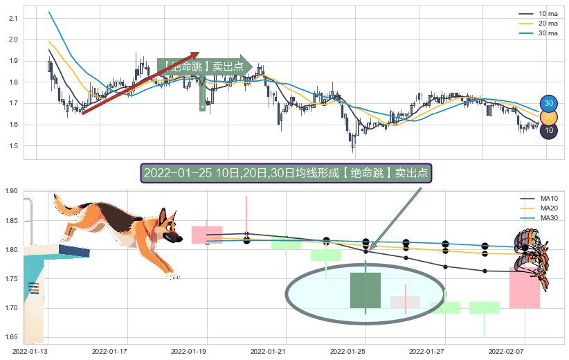 形态多维评估: ⚀ 2022-01-25日显现 10日-20日-30日均线 【绝命跳】卖出点 看空信号,后市看跌,卖出