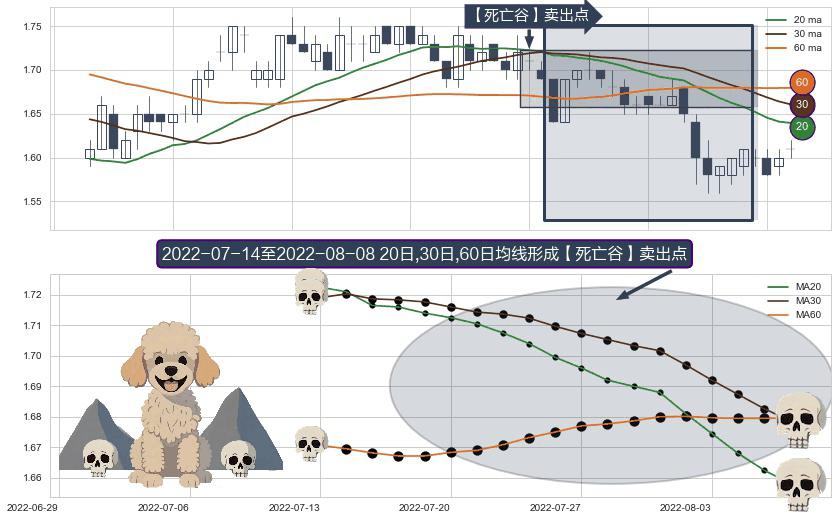 形态多维评估: ⚀ 2022-07-15-日至2022-08-08-日显现 20日-30日-60日均线 【死亡谷】卖出点 看空信号,后市看跌,卖出