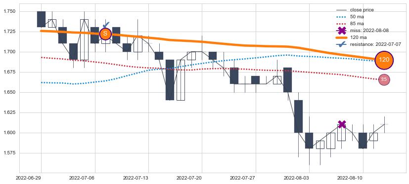 下跌趋势2022-06-29-2022-08-12,均线120确认关键阻力1处