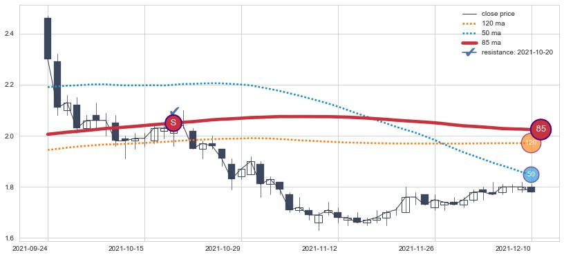 下跌趋势2021-09-24-2021-12-10,均线85确认关键阻力1处