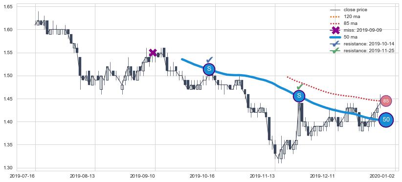 下跌趋势2019-07-16-2020-01-02,均线50确认关键阻力2处
