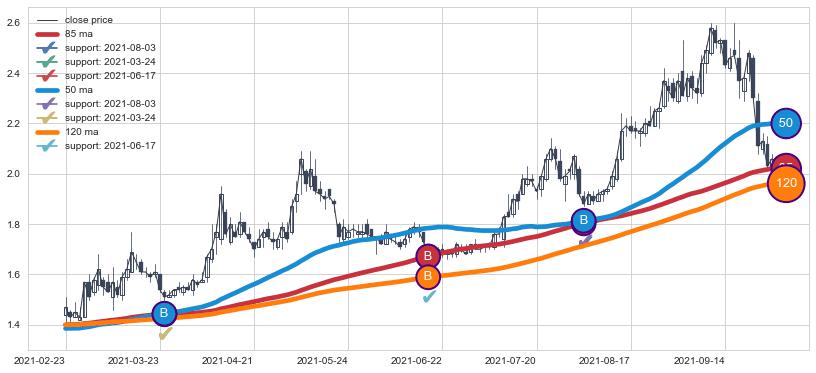 上涨趋势2021-02-23-2021-09-30,均线120, 50, 85确认关键支撑3处