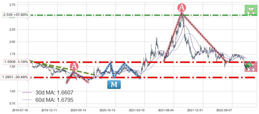 ♘ 阻力价格位2.539,可信任强度56.99%,距离最后交易2022-08-12形成的收盘价格1.6100相差 +57.69%