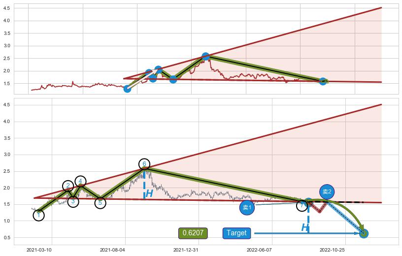 ➢ 最小反转跌幅→𝐇: 0.9375 (逐步抬高阻力斜边最后的阻力点⑥与支撑边垂直距离)