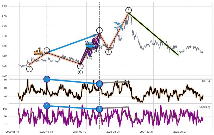 ➢ 第一, 三驱动浪端点:【KDJ】走势出现【常规背离 & 反转信号】背离程度26.51%,背离夹角角度59.8˚,背离程度较小