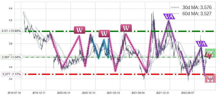 ♘ 阻力价格位3.567,可信任强度46.43%,距离最后交易2022-08-12形成的收盘价格3.530相差 +1.04%