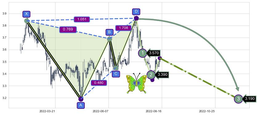 ➣ 已完成【蝴蝶】形态起点X: 2022-02-10, 终点D: 2022-07-13, 共104交易日
