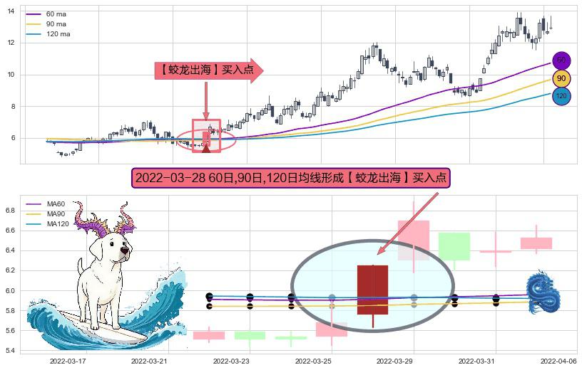 ⚀ 2022-03-28日显现 60日-90日-120日均线 【蛟龙出海】买入点 看多信号,后市看涨,买入