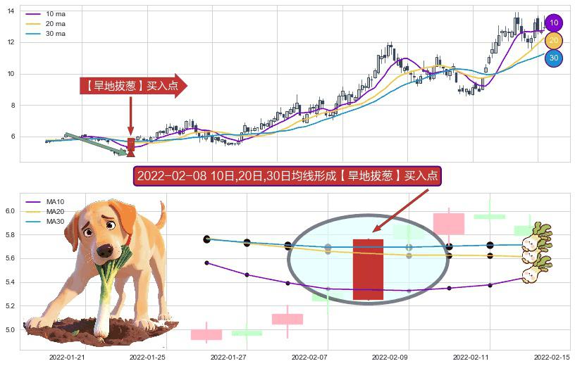⚀ 2022-02-08日显现 10日-20日-30日均线 【旱地拔葱】买入点 看多信号,后市看涨,买入
