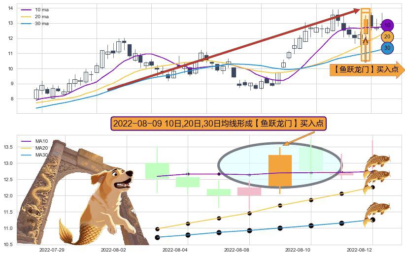 ⚀ 2022-08-09日显现 10日-20日-30日均线 【鱼跃龙门】买入点 看多信号,后市看涨,买入