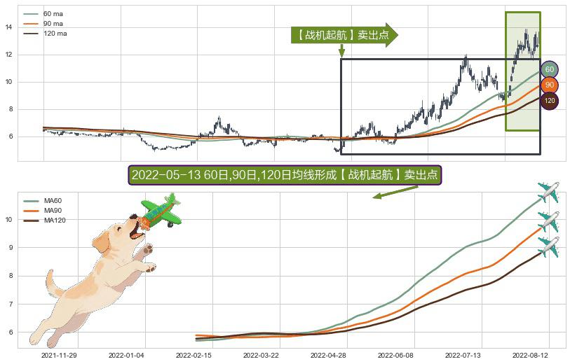 ⚀ 2022-02-07日-2022-08-12日显现 60日-90日-120日均线 【战机起航】卖出点 看空信号,后市看跌,卖出