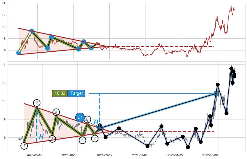 ➢ 最小中继整理涨幅→𝐇: 3.813 (高点逐步降低斜边第一阻力点②与支撑边垂直距离)
