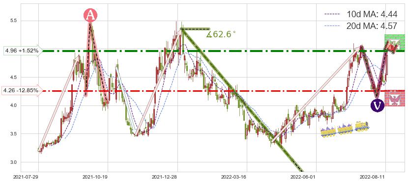 ♘ 支撑价格位4.26,可信任强度66.96%,距离最后交易2022-08-12形成的收盘价格4.89相差 -12.85%