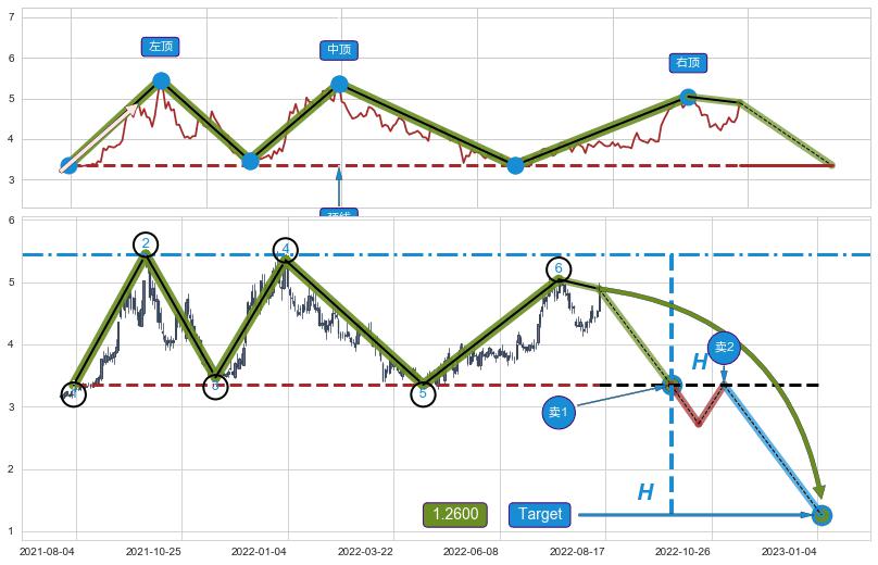 ➢ 最小反转跌幅→𝐇: 2.090 (三重顶波峰高点到两个波谷连线的垂直距离)