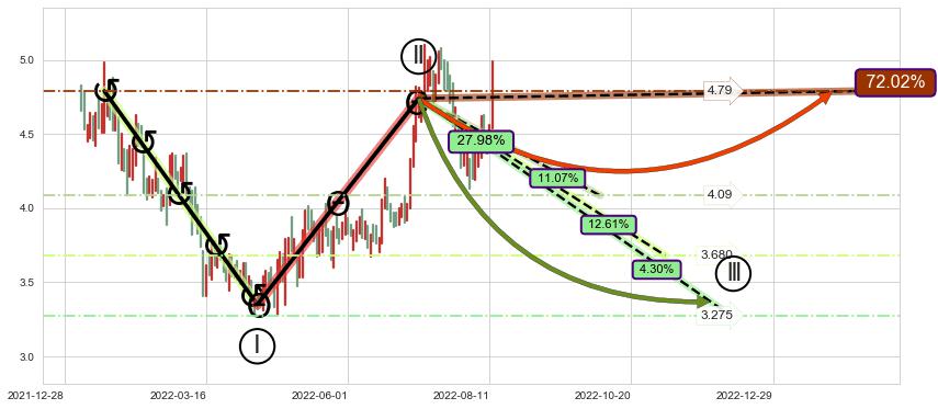 ➣ 循环浪继续向下【平均值】位置(2022-11-07, 3.680),匹配聚类样本比例45.06%, 可能性概率12.61%