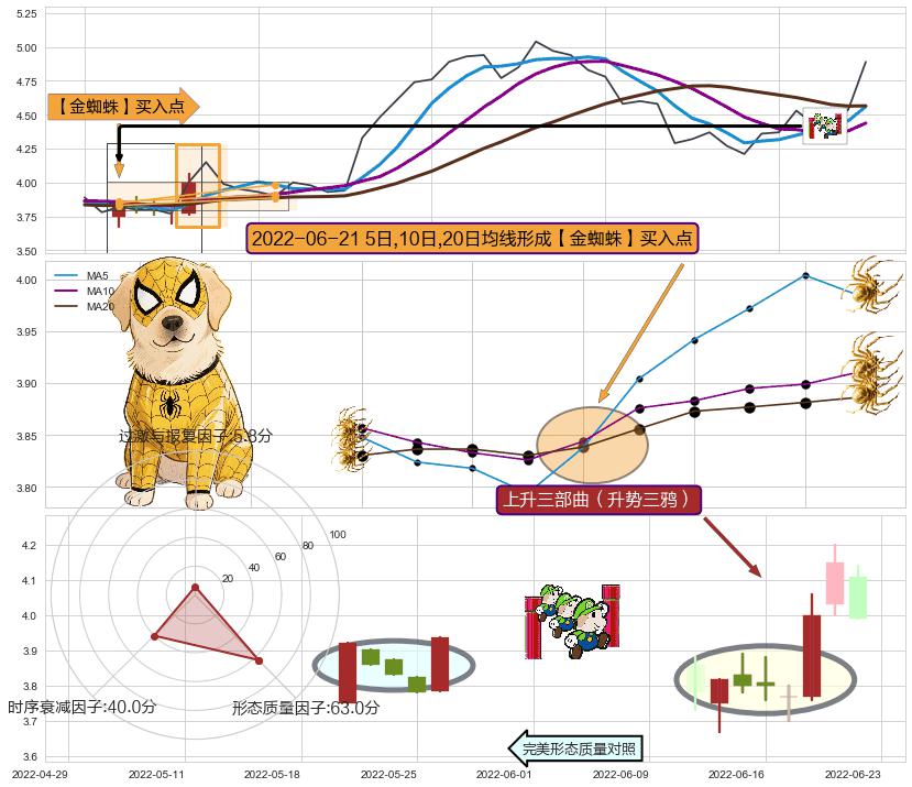 | 4 🅚:单针探底(定海神针) ➕ 🎢:【金蜘蛛】买入点均线组合买入点信号形成后,猜想三条均线周期内的交易者都看好后市,持续上涨 ☞ 看多信号 ⇥ 【均线】交织【🅚线】⇥ 综合量化分数: 51 | > |
