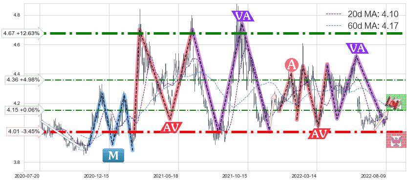 ♘ 阻力价格位4.15,可信任强度49.65%,距离最后交易2022-08-12形成的收盘价格4.15相差 +0.06%