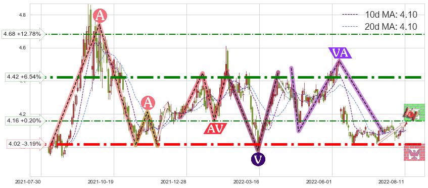 ♘ 阻力价格位4.42,可信任强度90.80%,距离最后交易2022-08-12形成的收盘价格4.15相差 +6.54%