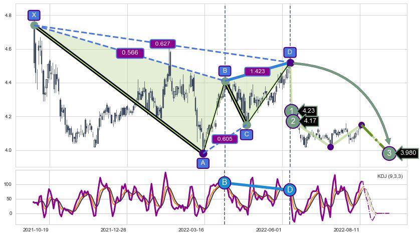 ➣ D点拟合预测价格4.21,距离最后交易收盘价格4.15相差 +1.39%