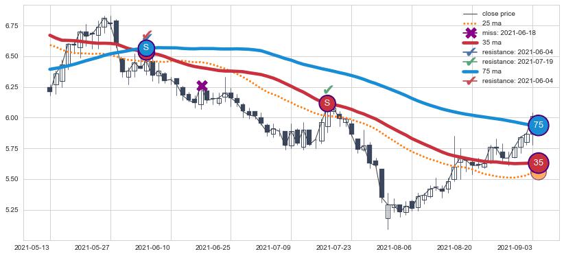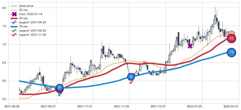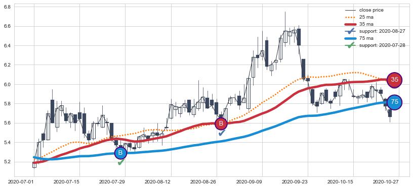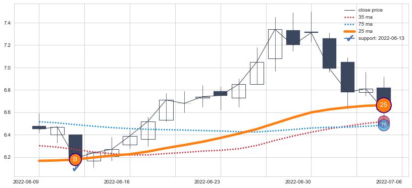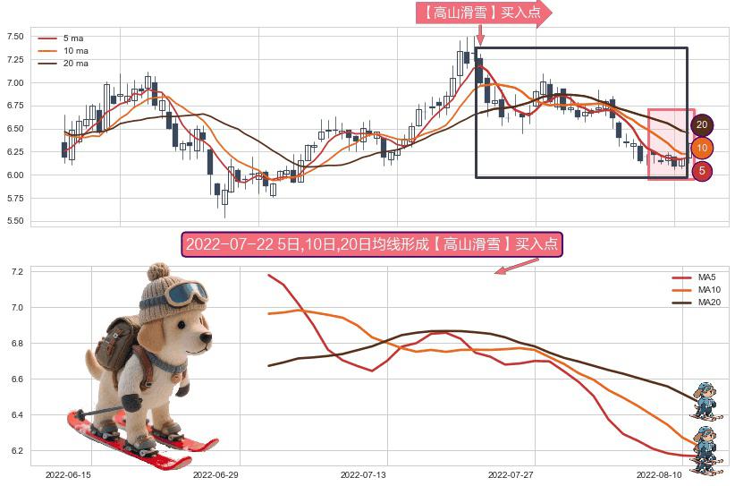 ⚀ 2022-07-01日-2022-08-11日显现 5日-10日-20日均线 【高山滑雪】买入点 看多信号,后市看涨,买入